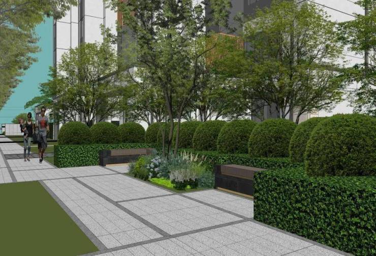 西门入口增设特色水景景观,都说“遇水聚财”,寓意很讨巧。东西横向中轴,选用5至6米高的樱花树,全冠移植,打造凤屿山河的樱花大道,未来业主不用去鼋头渚,也能一赏春色如许。