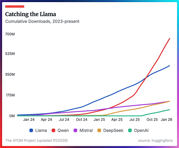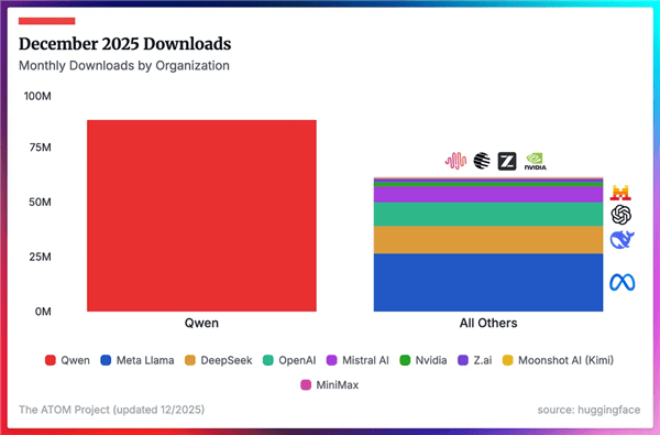 仅凭5款小尺寸模型,其在2025年12月的单月下载量便已超越 Mistral、OpenAI、英伟达等6家国际领先AI厂商旗下所有开源模型当月下载量的总和。