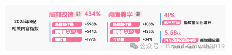 年轻人将资源精准投注于卧室、桌面、车内等完全可控的微观空间,通过打造高体验浓度的“个人结界”重获生活掌控感与情绪能量。从数据看,“局部改造”相关内容实现434%的增长,在消费品类上也呈现多样化,不论是居家还是汽车、书房,均成为改造重点。