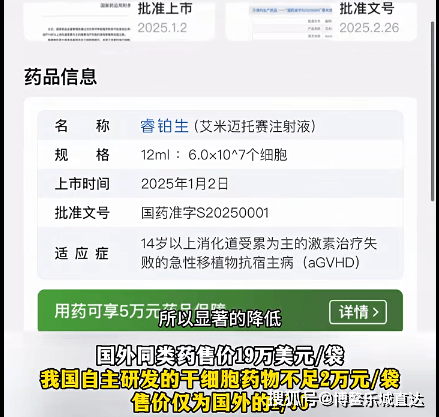 这款干细胞药不只是给患者带来希望,还大大减轻了他们的经济负担。北大人民医院的医生说,美国同类药一袋要19万美金,中国这款才约2万人民币,能帮患者省不少钱,大家对这药期待也高。