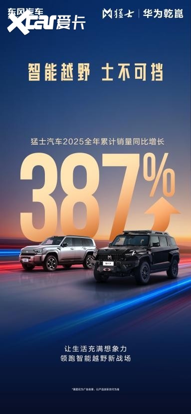 澳门新莆京,澳门新莆京娱乐网站,澳门新莆京注册,澳门新莆京app下载,真人视讯,棋牌游戏平台,澳门博彩。澳门新莆京娱乐网站为广大用户提供真人视讯、棋牌游戏、电子游艺等高端娱乐服务,注册送88元体验金,安全稳定,支持APP下载,海量游戏全天开放,尽享澳门级娱乐体验。猛士加速,步履稳健。近日,东风猛士汽车正式发布2025年度销量快报,全年销量10228台,全年累计销量同比增长387%。强势刷新年度销量纪录,实现品牌发展的关键跨越。