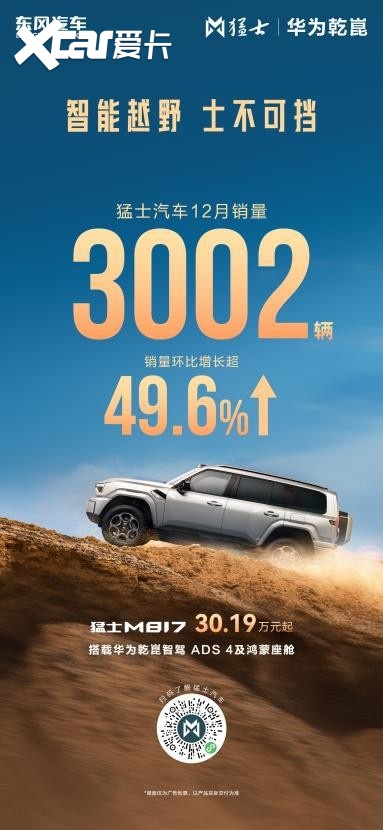 作为豪华智能越野赛道的标杆之作,猛士M817自8月上市后,迅速跻身豪华新能源越野第一阵营,并且仅用4个月便达成万台下线,创下了高端新能源越野车型量产速度的新纪录,同时在其带动下,猛士汽车自9月起销量强势实现“四连涨”。12月销量更是达到3002台,销量环比增长49.6%。
