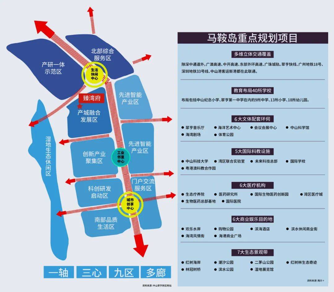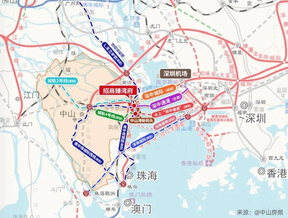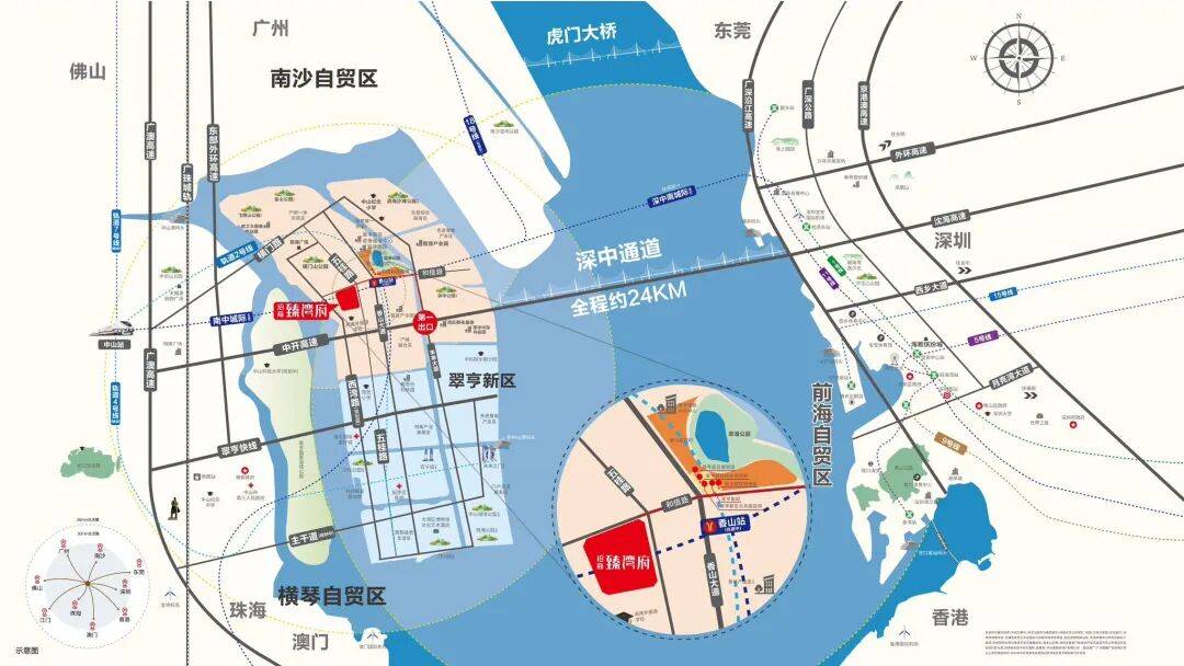马鞍岛扼守大湾区交通枢纽位置,坐拥“一桥一港双站三轨道四快线”海陆空立体交通路网,深中通道(已开通)约30分钟迅达前海(信息来源:南方+),区域内还汇聚了广澳高速、中开高速、东部外环高速、广珠城轨、翠亨快线等湾区重大交通设施,更有广州地铁18号线延长线号线(规划中)在此设站联通,完美实现大湾区核芯区域的全面交往互通。